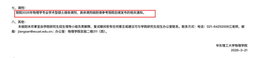 华东理工大学2026年物理学专业学术型硕士接收调剂,具体调剂细则请参考学院后续发布的相关通知。