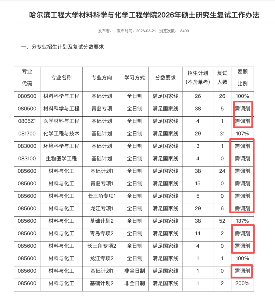 哈尔滨工程大学材料科学与化学工程学院公布了2026年硕士研究生复试工作办法,其中材料科学与工程、医学材料与工程、环境科学与工程、 材料与化工等多个专业今年都招收调剂。