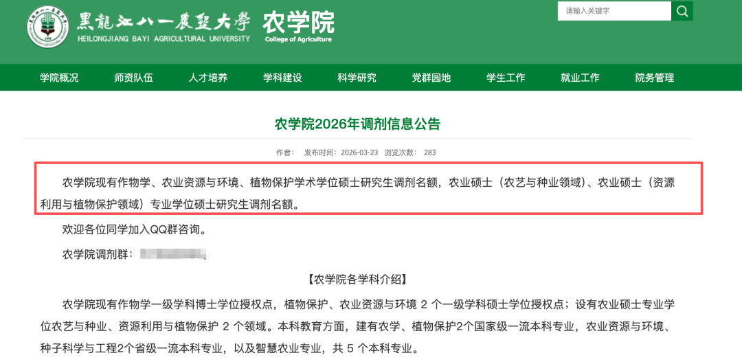 农学院现有作物学、农业资源与环境、植物保护学术学位硕士研究生调剂名额,农业硕士(农艺与种业领域)、农业硕士(资源利用与植物保护领域)专业学位硕士研究生调剂名额。