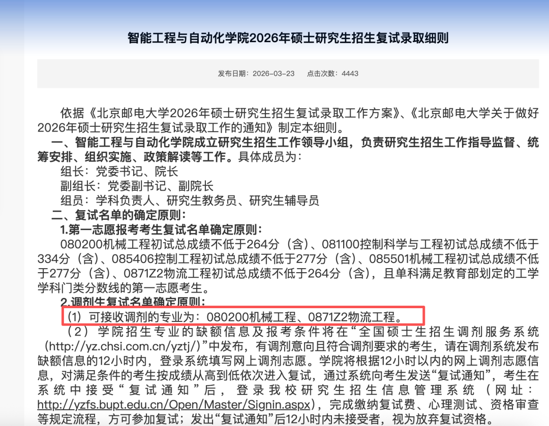 今年可接收调剂的专业为:080200机械工程、0871Z2物流工程。